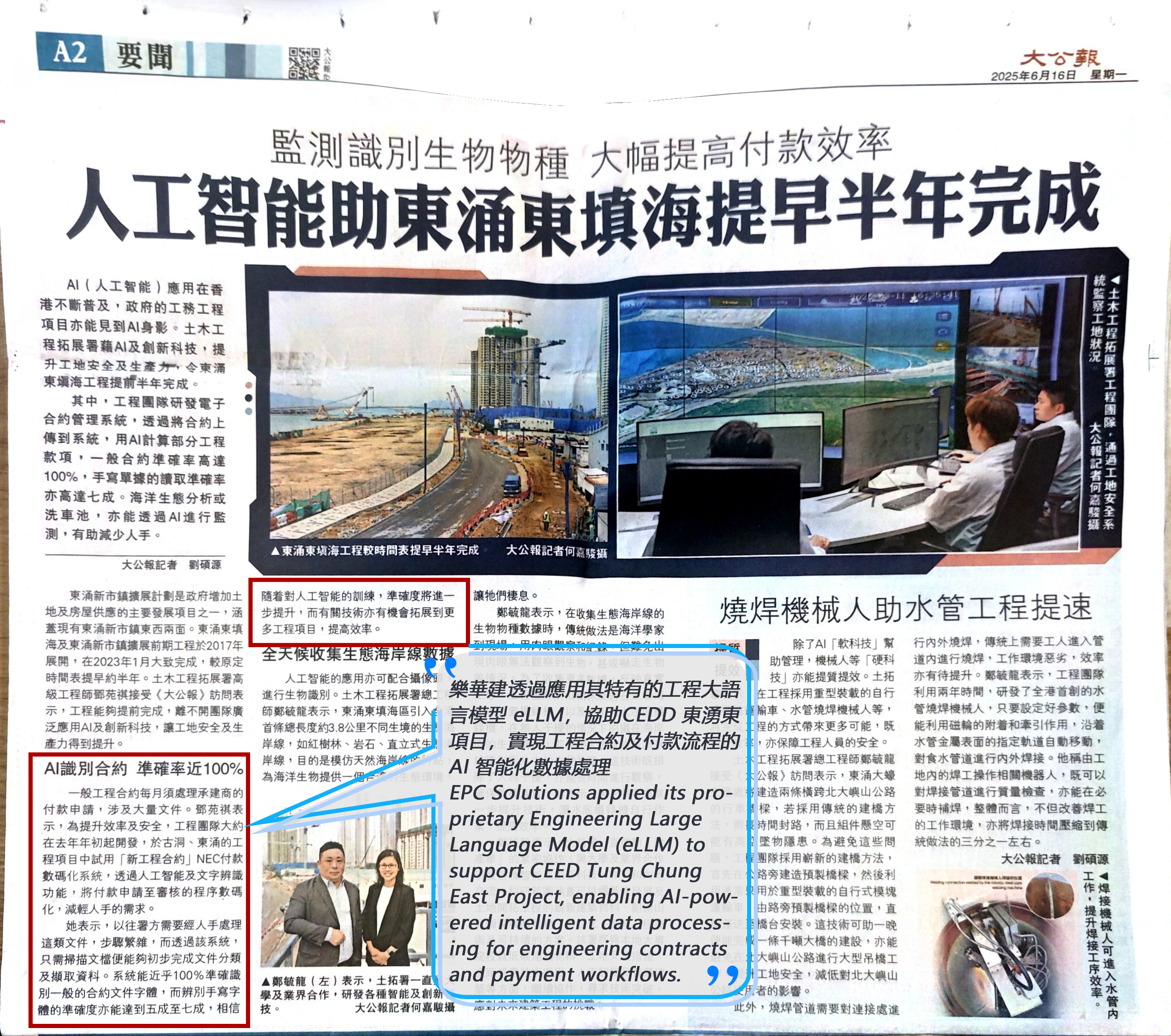 《大公报》在报道中指出,多家科技企业在项目中应用AI技术,乐华建科技(香港)有限公司(EPC Solutions)作为其中一家AI应用提供商之一,凭借特有的工程大语言模型eLLM,提供工程合同和付款过程的AI智能化数据处理能力,为项目管理的高效、准确作出积极贡献。